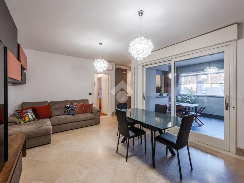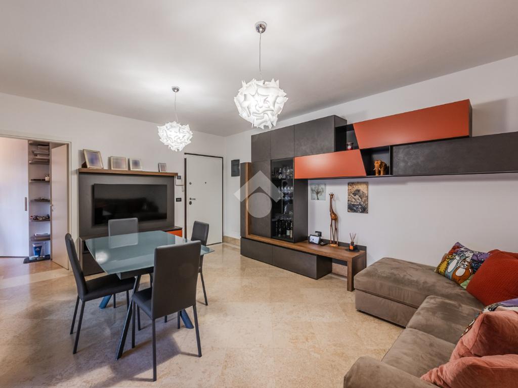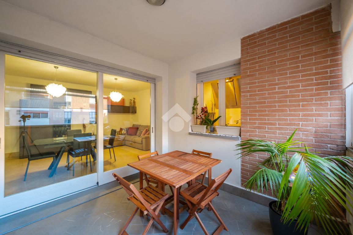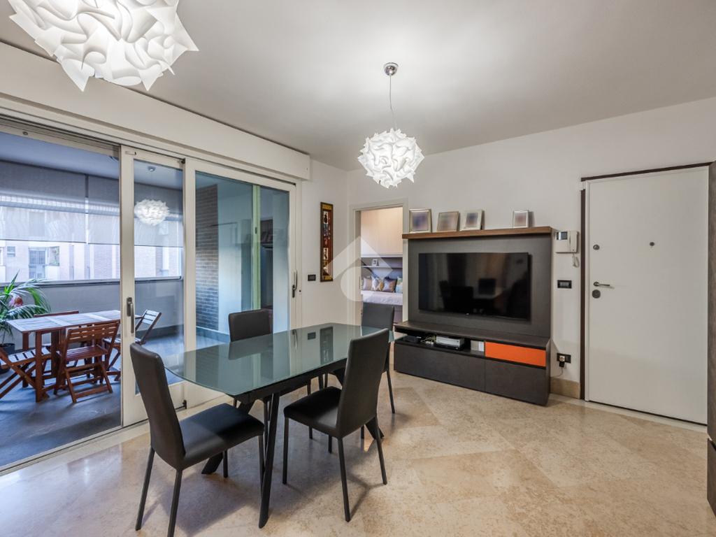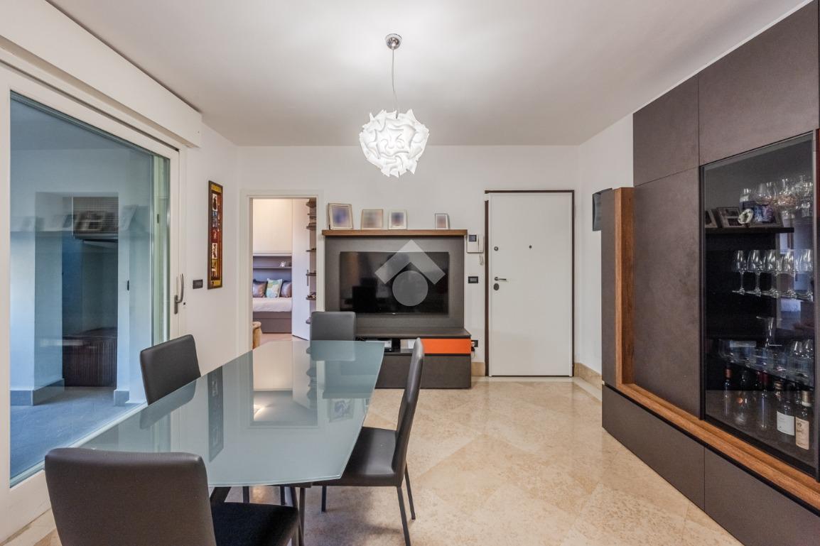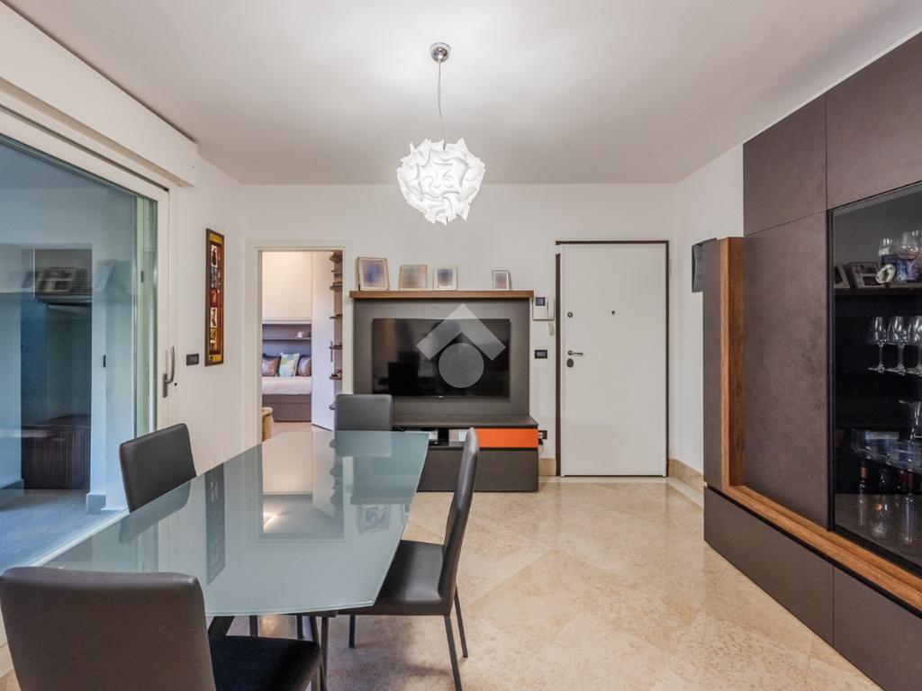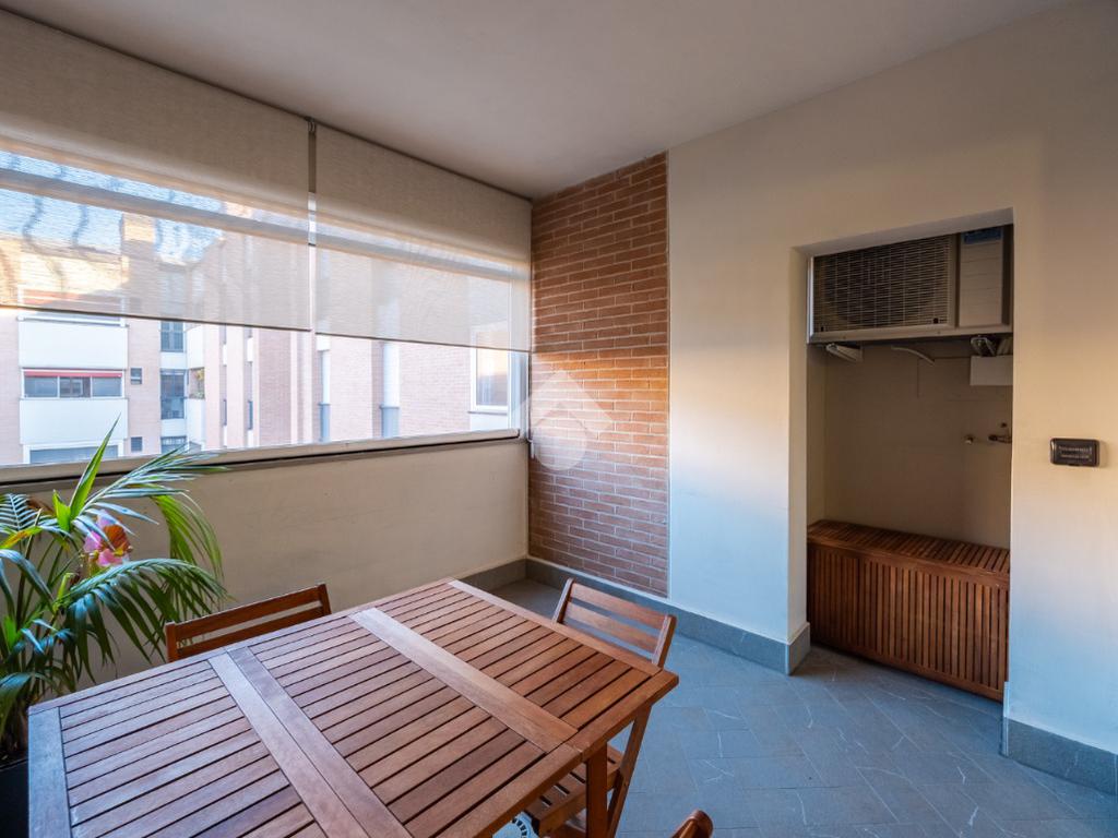 Ingresso direttamente sulla zona living, in cui soggiorno e angolo cottura, parzialmente separati, convivono armoniosamente, terrazza abitabile di oltre 9 mq, disimpegno zona notte, due camere da letto, uno studio e due bagni. Completa la proprietà una spaziosa autorimessa al piano interrato. Il riscaldamento è di tipo centralizzato con teleriscaldamento e le spese di gestione condominiali risultano contenute.